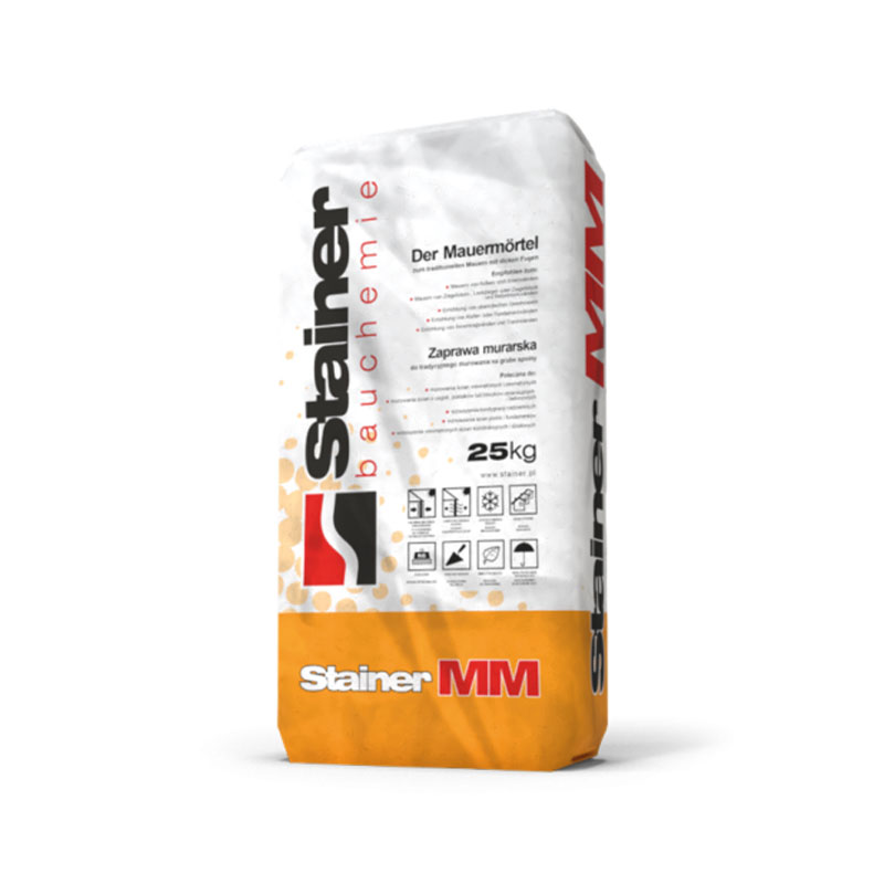 Zaprawa murarska Stainer MM przeznaczona jest do murowania tradycyjnego na tzw. grubą spoinę. Grubość zaprawy w spoinie może wynosić od 3 do 20 mm, co pozwala na kompensowanie odchyleń w wymiarach łączonych elementów murowych. Zaprawa zawiera wapno hydratyzowane, które polepsza przyczepność do podłoża i wpływa na jakość oraz trwałość wykonanego połączenia murarskiego. Wapno poprawia także szczelność spoiny, zapobiega powstawaniu mikropęknięć, a także zwiększa elastyczność i odporność muru na obciążenia dynamiczne (np. drgania budynku w pobliżu ciągów komunikacyjnych). Wapno posiada także właściwości grzybobójcze. Zaprawa murarska Stainer MM może być stosowana zarówno wewnątrz jak i na zewnątrz. Przeznaczona jest do pustaków ceramicznych, bloczków gazobetonowych, bloczków silikatowych, bloczków keramzytowych oraz bloczków betonowych.